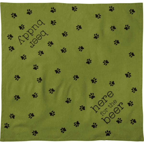 A large reversible pet bandana featuring "Beer Buddy" and "Here For The Beer" sentiments on opposite corners with all-over print design.